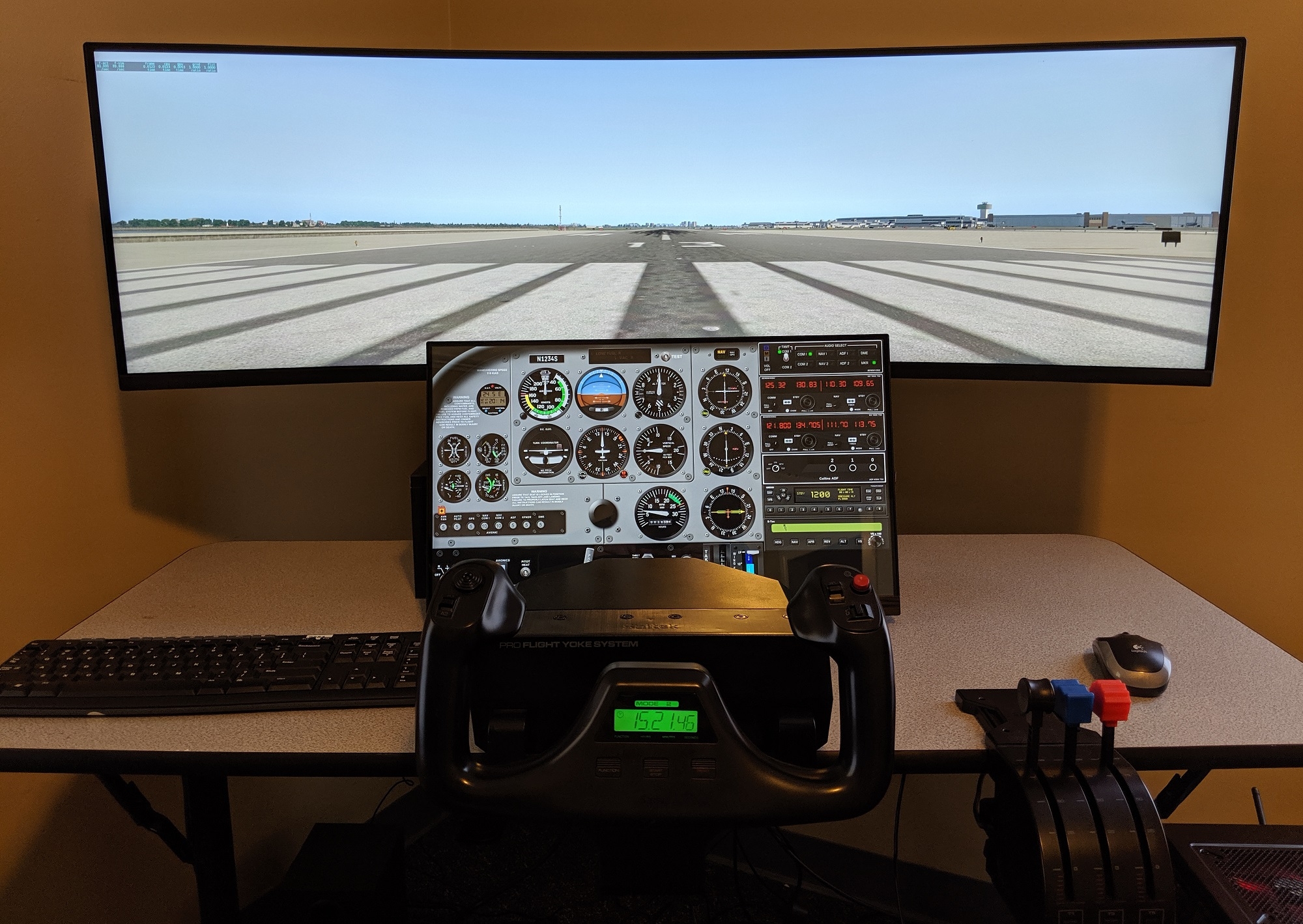 We have included everything you need to get flying, except a table and chair. The large 49″ super ultra-wide screen allows you to dedicate it to just the scenery. Meanwhile, the touch monitor can be used to run air manager to display your instruments.
