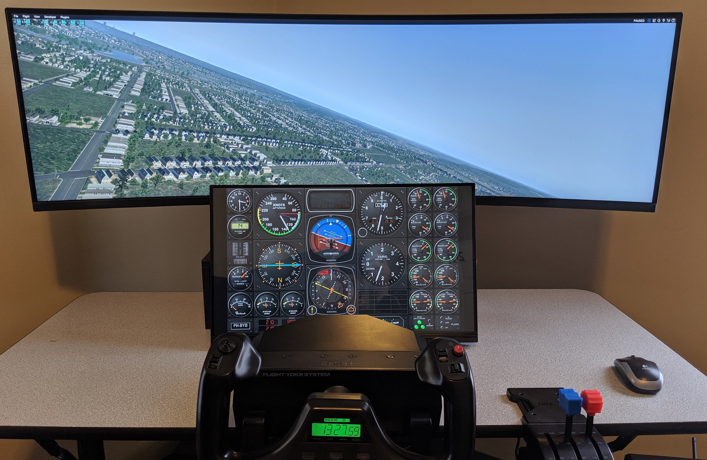 Why use a 49″ monitor? By using a 49″ monitor, we are able to get nearly the same amount of lateral coverage as a triple-display system while only using ONE monitor connection of the four available. This allows you to use one of the connections for the touchscreen, and still have two left over. With the two remaining connections, you could add a RealSimGear 530, 430, 530/430 combo, or even add the G1000 suite. Also, setting up the system is a lot less complicated with the one 49″ monitor (instead of three 27″ monitors) for your scenery.